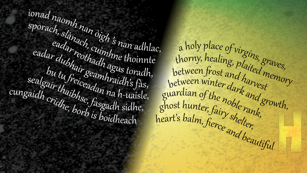 As well as reflecting ancient rituals of tasks set for bridegrooms and potential kings, Culhwych's tasks of finding the mystical Thirteen Treasures of Britain not only refer to his initation to kingship and marriage to the goddess, but also to the symbolism of thirteen, representing both the year (of thirteen months) and the resulting 'geis' of such acquired knowledge. For 'geis' is a strict code that has inherent invincibility coupled to binding conditions on those who accept it. Hard won delight is the gift of the May tree. And it is this that helps explain why a taboo existed about bringing it into the house, which by tradition, invited death (ie the giant) and was known as a bad month for marriage. This fine balance of geis is illustrated also in the ballad of Thomas the Rhymer, who, playing his harp by the the Eildon Tree, a hawthorn at Ercildoune, was taken away for seven years by the Queen of Elfland. She gave him his geis, the gift of prophecy, on condition that he never lied, which led to his becoming known as 'True Thomas'. The planetary balance on hawthorn is similarly dual, being described as 'Venus in Aries' by herbalists. Aries is controlled by Mars, so the prickly protective thorns can be seen as the Mars influence, while the influence of Venus is evident in the art, sexuality, beauty and flowers of hawthorn. Her bird is the raven