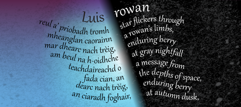 When Diarmid and Grainne were fleeing from the revenge of Fionn, leader of the Fianna, they first hid in the highest cave in Ireland before moving to the wood of Dubhros, where they found a magic rowan. This tree was grown from a berry of the 'Land of the Ever-Living Ones' (elves), and guarded day and night by Searbhan Lochlannach, The Surly One of Lochlann, to prevent anyone eating its berries. A gigantic, ugly hulk, with one eye and a mighty iron club, Searbhan allowed Diarmuid and Grainne to hide in the tree and eat its berries, which were very healing, while Fionn and four hundred warriors of the Fianna, waited at the foot of the tree to kill the lovers. Fortunately, Aonghas Og ('young angus', a powerful spirit and Diarmuid's tutor), helped Grainne to disappear immediately into the Otherworld. This gate between worlds feat neatly indicates the tree as quicken/rowan, as do the themes of health, young lovers, music and above all, protection.