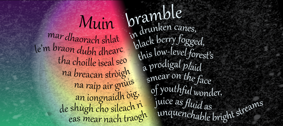 Although not a tree, the origins of Muin belong with the vine, which is strictly a shrub or small tree. Necessarily, the vine became transposed to bramble, when transplanted from Greece to Britain. The flowers of bramble have five petals and are rose-like white or pink, 2-3cm across, that appear from June to August, followed by the familiar blackberry fruit.